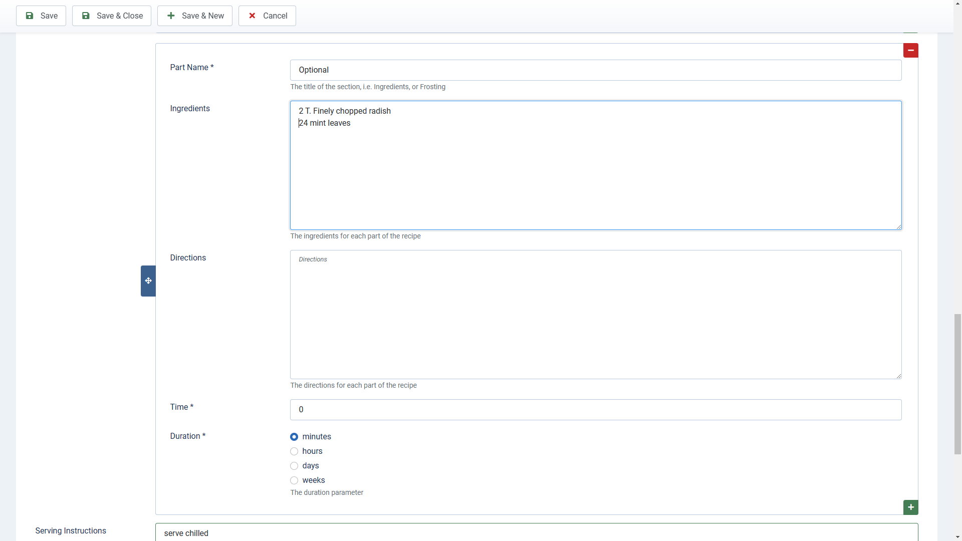 The parts button will add a subform with an Ingredients, Directions and time section. For easy recipes, this will be the extent of the information. Note that the display works best if there is just one ingredient per line. You can add simple markup like bold, italics etc.